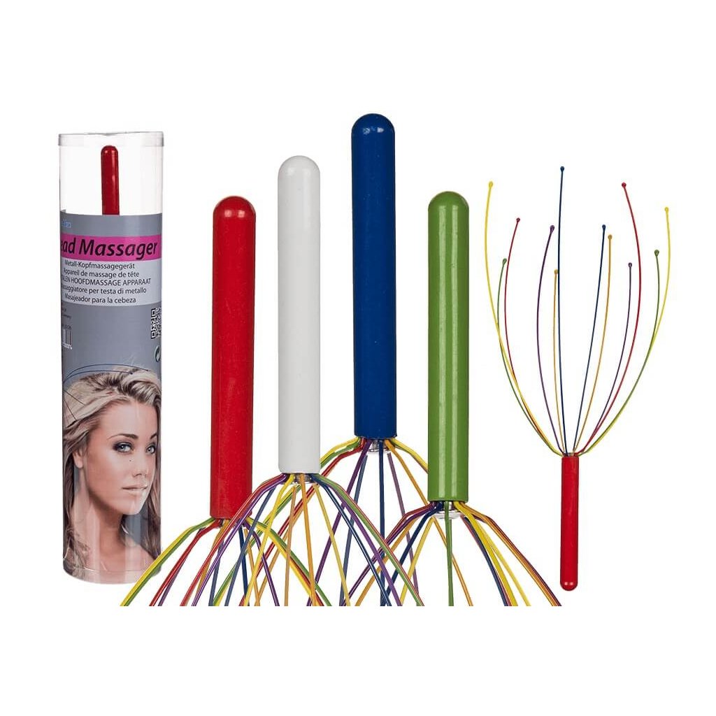 Kovová masážní pomůcka na masáž hlavy. Dvanáct různě barevných drátků. Masírovač hlavy v barevném provedení. Baleno v plastovém blistru. Materiál kov. Rozměr cca 25cm. Mix barev rukojeti bez možnosti výběru.