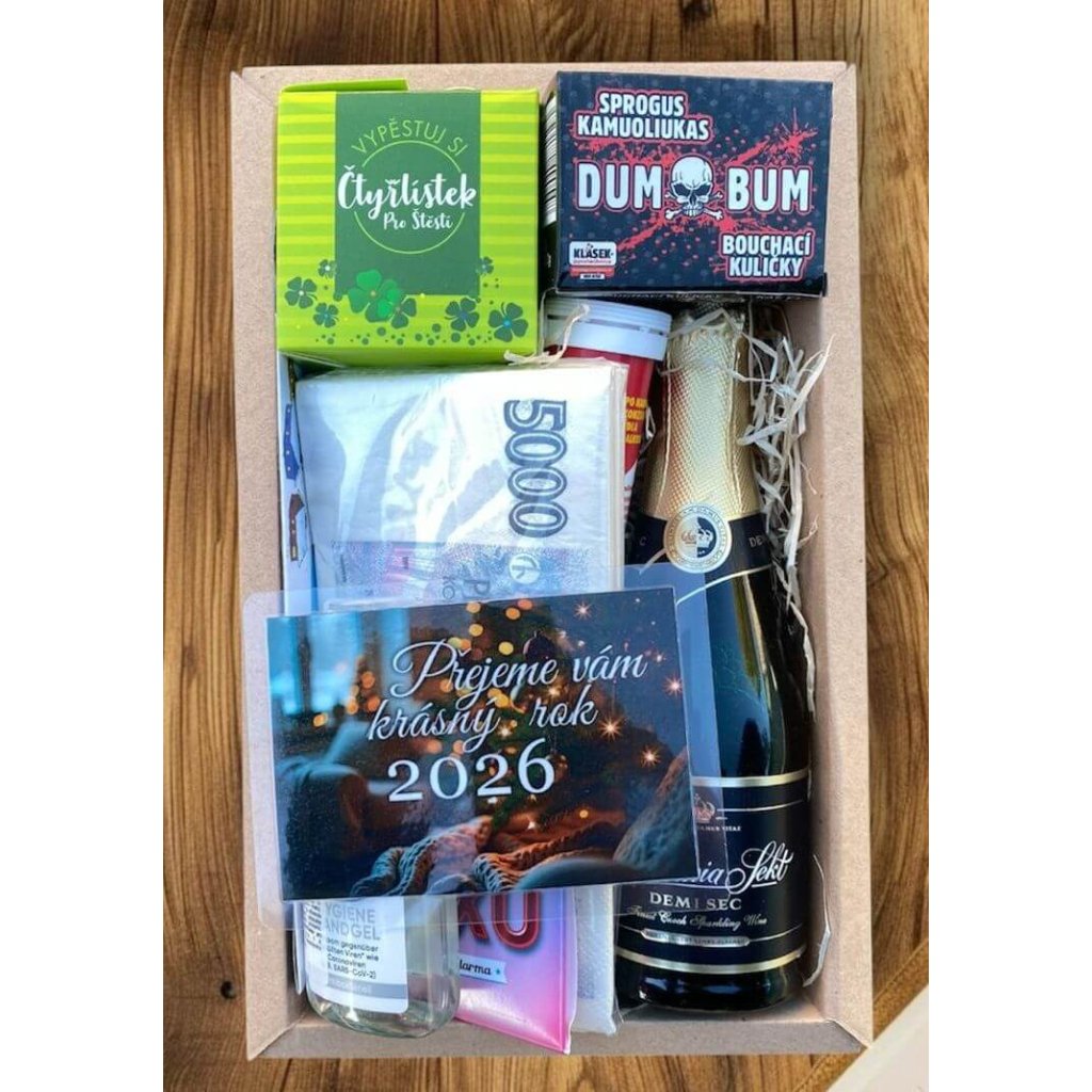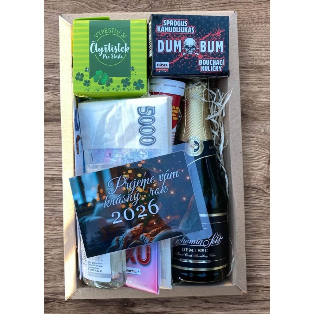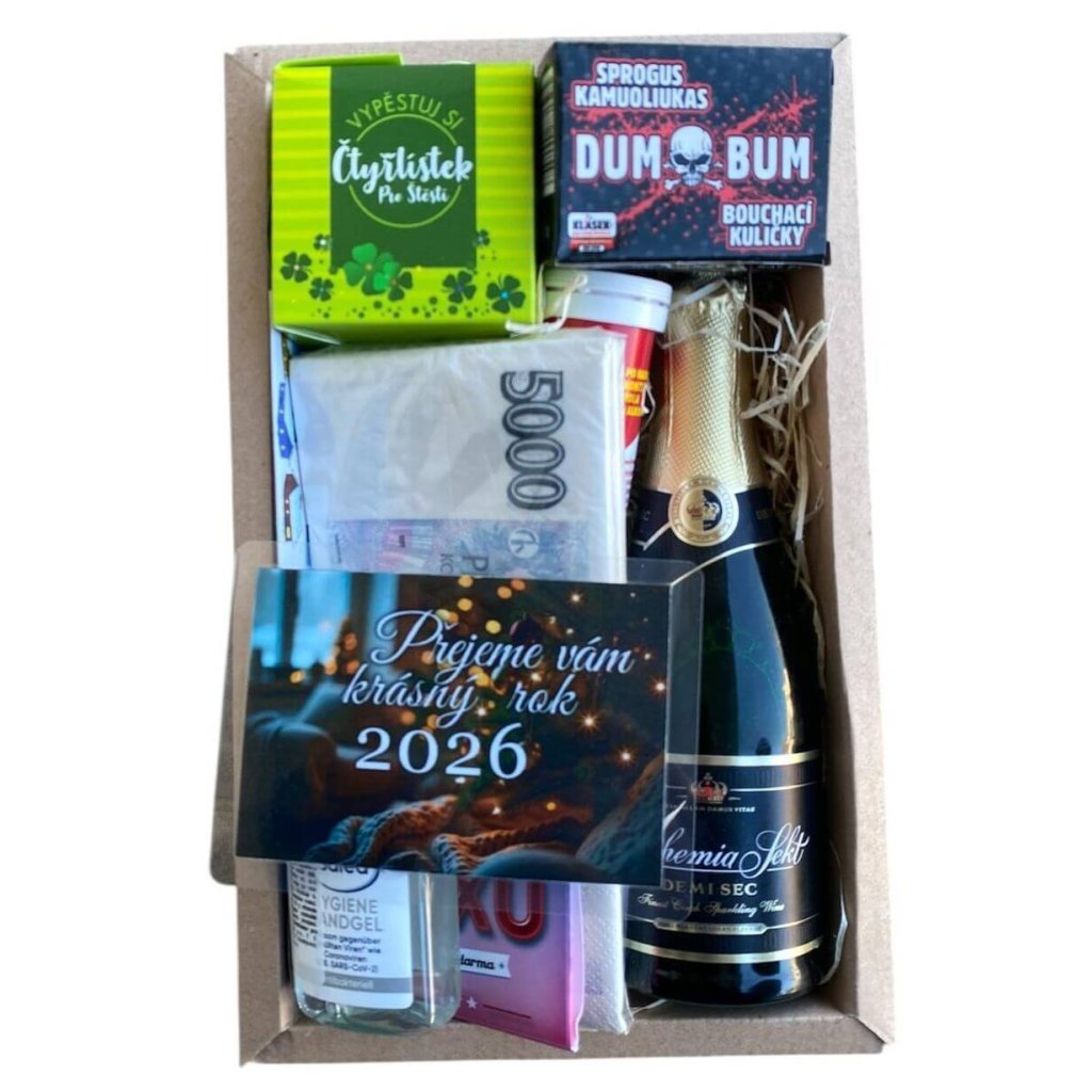 Dárkáč Silvestr 2025: Přežij to ve zdraví Pečlivě jsme pro vás vybrali TOP z našich nejlepších produktů a udělali jsme balíček přímo na míru. Dárková krabička obsahuje naše oblíbené produkty: Mini Sekt Bohemia 0,2l Vypěstuj si štěstí - čtyřlístek Malá čokoláda - SOS energie Špunty do uší Prskavky (10ks) Bouchací kuličky Vyprošťovák - 20 šumivých tablet Mini dezinfekce Kondom Kapesník ,,pětitisícovka" Kartička - PF2026 Vše zabaleno v jedné krabičce za výhodnější cenu. Dárkové balíčky pro vás balíme ve vlastním skladu z těch nejlepších produktů. Balíček je dostupný pouze na našem e-shopu.