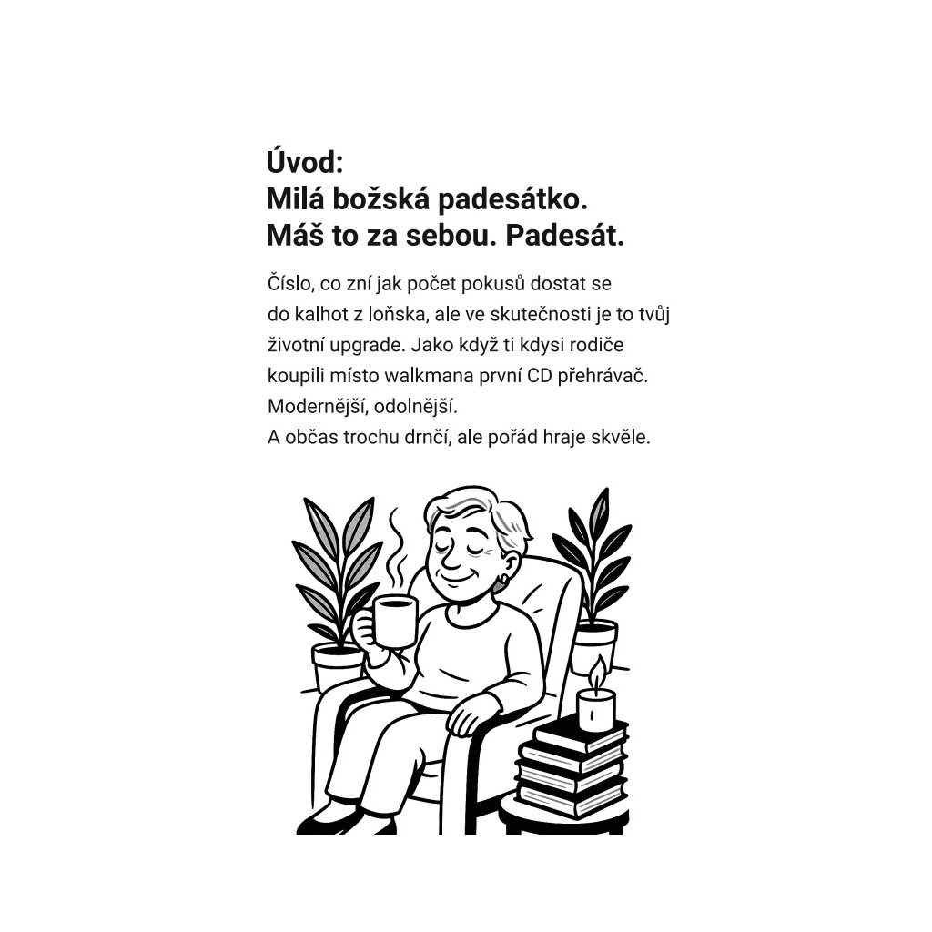 Padesátka? Gratulujeme! Právě jsi povýšila na verzi 5.0 – sebevědomou, zkušenou a s luxusem dělat si věci po svém. Tahle kniha je tvůj humoristický manuál, jak si užít padesátku bez stresu, s nadhledem a šálkem dobré kávy v ruce.