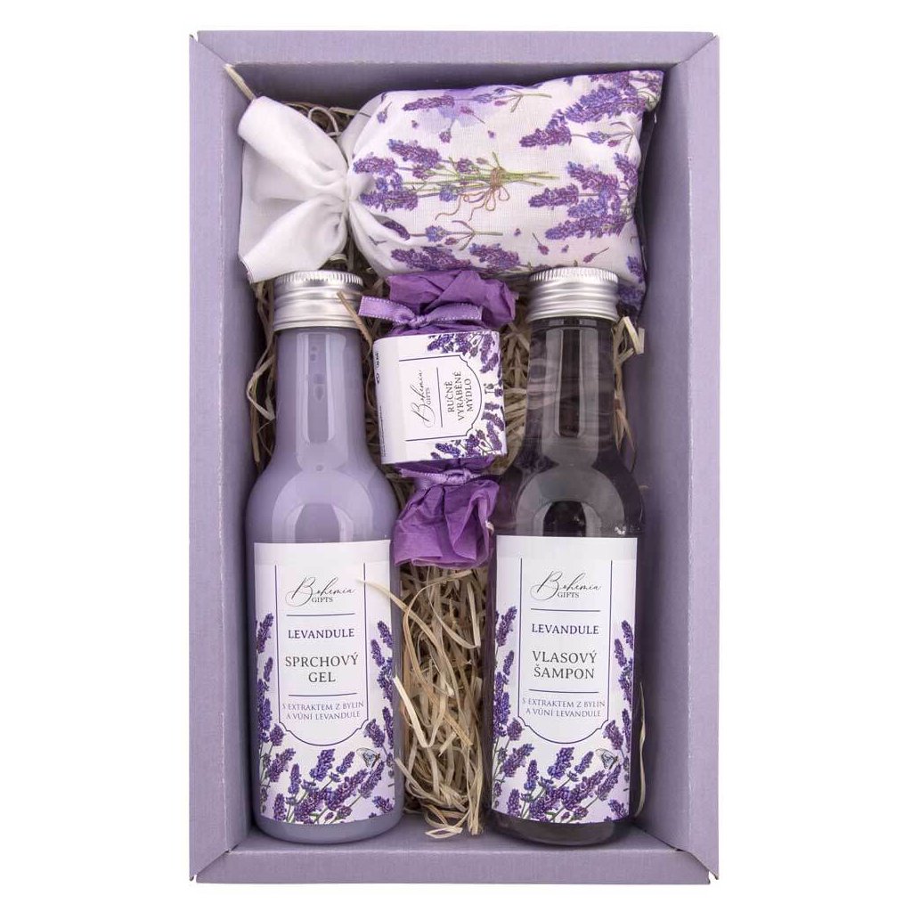 Olejový sprchový gel a relaxační vůní levandule. Velmi jemná kombinace ošetřujícího oleje ošetřuje pokožku a vrací ji přirozenou vlhkost, pružnost a hebkost. Sprchový gel s vůní levandule má pH přizpůsobené na maximální šetrnost k pokožce. Vlasový šampon s velmi příjemnou vůní levandule a dvě malá mýdla na denní hygienu, nebo na uvolňování levandulové vůně do místnosti. Ideální jako dárek pro ženy.