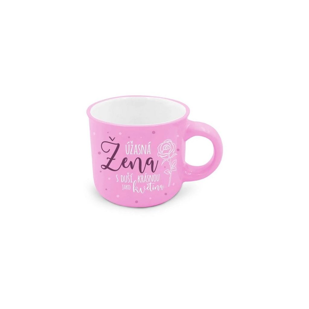 Úžasná žena si zaslouží něco opravdu vyjímečného, třeba dárek v podobě mini hrnečku na espresso s věnováním: „úžasná žena s duší krásnou jako květina“.