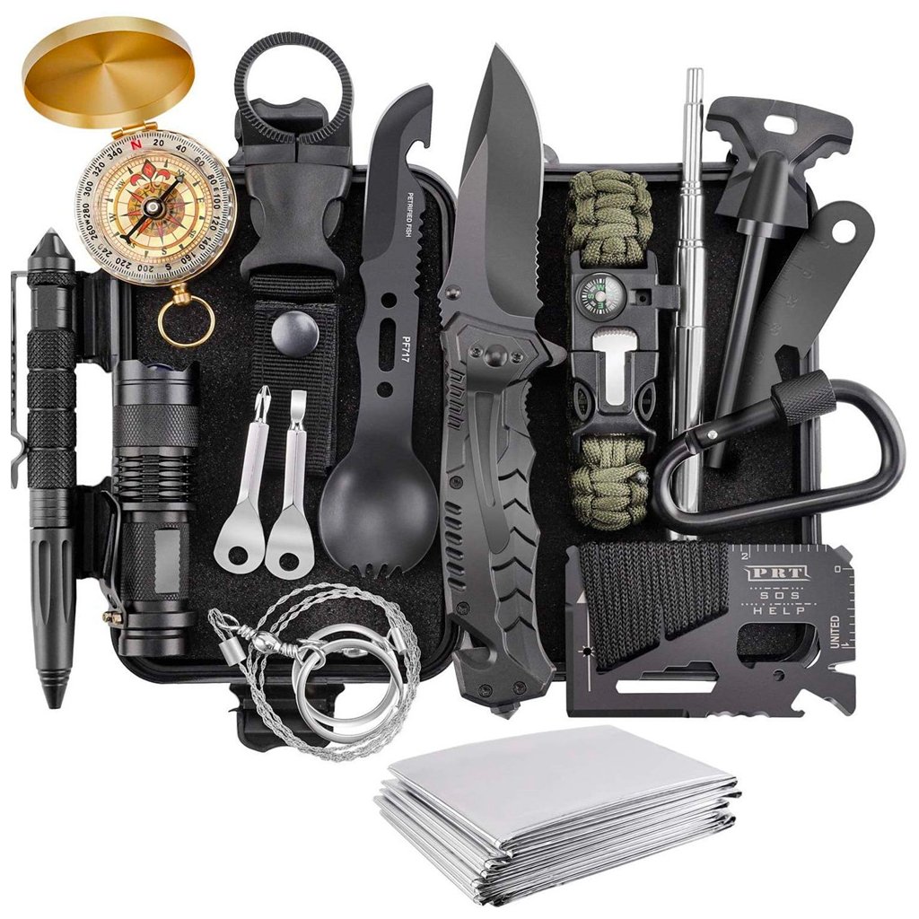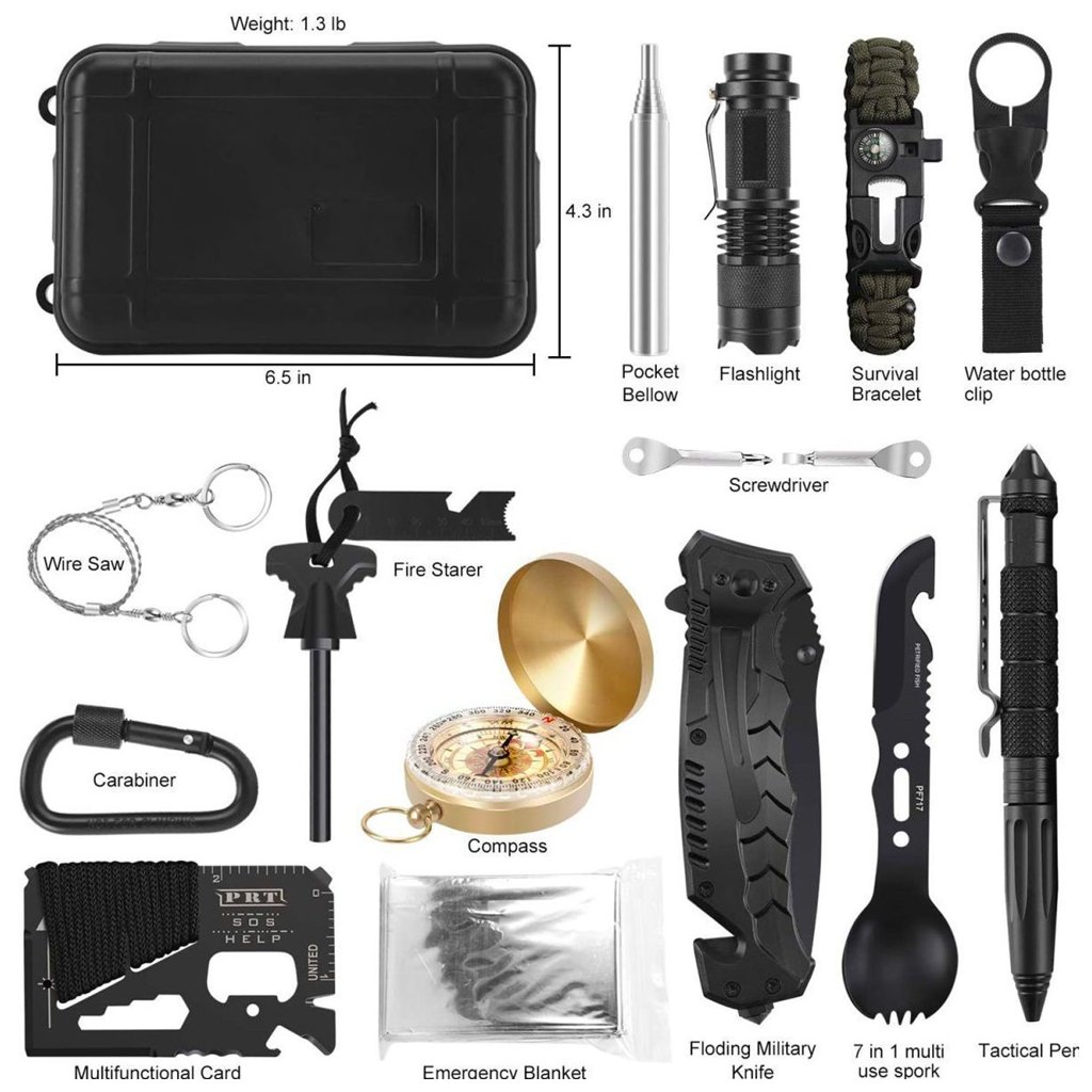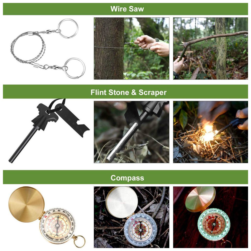 Obsahuje nůž, kompas, křesadlo, multifunkční kartu, svítilnu, nouzovou deku a další vybavení. Ideální pro kempování, turistiku, outdoor i survival.