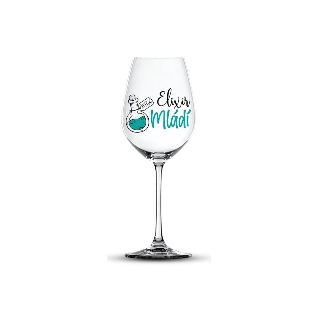 Dárková sklenice na víno s textem ,, Elixír mládí “. Ideální společník na oslavy, večírky ale i k relaxaci po náročném dni. Vtipný dárek pro milovníky vína, nejen k narozeninám.