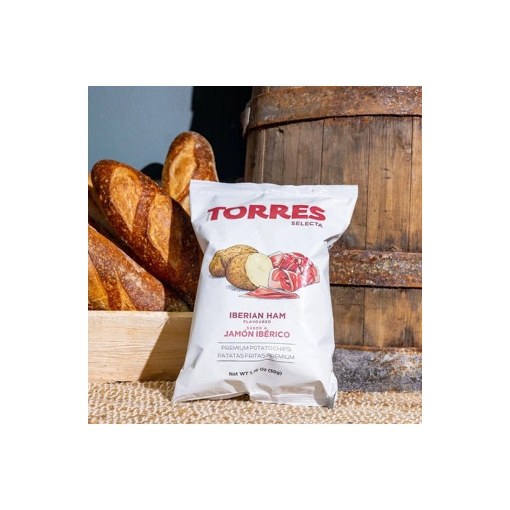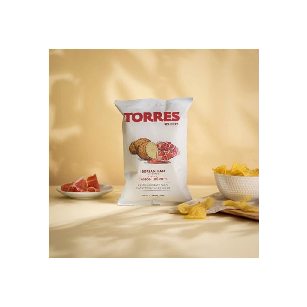 Objevte autentickou chuť Španělska s prémiovými chipsy Torres Jamón Ibérico. Tyto gurmánské bramborové chipsy přinášejí intenzivní a dokonale vyváženou chuť slavné iberské šunky, která patří mezi nejvyhledávanější delikatesy světa.